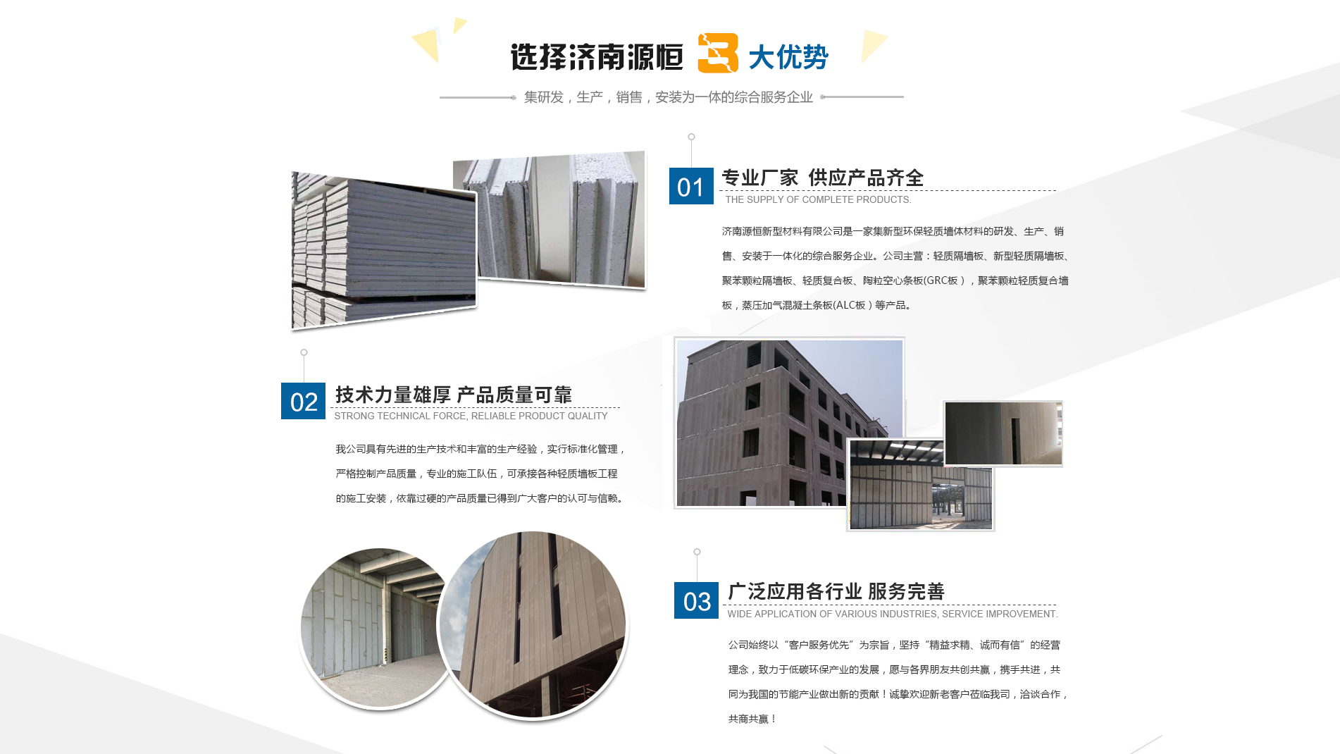 濟南源恒新型材料有限公司坐落于美麗的泉城濟南,是集新型環(huán)保輕質墻體材料的研發(fā)、生產(chǎn)、銷售、安裝于一體化的綜合服務企業(yè)。我公司具有的生產(chǎn)技術和豐富的生產(chǎn)經(jīng)驗,為您提供輕質隔墻板、新型輕質隔墻板、聚苯顆粒隔墻板、輕質復合板、陶??招臈l板(GRC板),聚苯顆粒輕質復合墻板,蒸壓加氣混凝土條板(ALC板)等產(chǎn)品,本公司有專的施工隊伍,可承接各種輕質墻板工程的施工安裝。輕質隔墻板是國家推廣使用的新型輕質、綠色無害建材,是墻改節(jié)能政策大力扶持的環(huán)保節(jié)能產(chǎn)品,是發(fā)達國家普遍采用的新型墻體材料。濟南源恒新型材料有限公司實行標準化管理,嚴格控制產(chǎn)品質量,依靠過硬的產(chǎn)品質量已得到廣大客戶的認可與信賴。公司產(chǎn)品遍布各大城市,與國內(nèi)多家客戶建立了良好的合作關系。公司始終以“客戶服務優(yōu)先”為宗旨,堅持“精益求精、誠而有信”的經(jīng)營理念,致力于低碳環(huán)保產(chǎn)業(yè)的發(fā)展,愿與各界朋友共創(chuàng)共贏,攜手共進,共同為我國的節(jié)能產(chǎn)業(yè)做出新的...